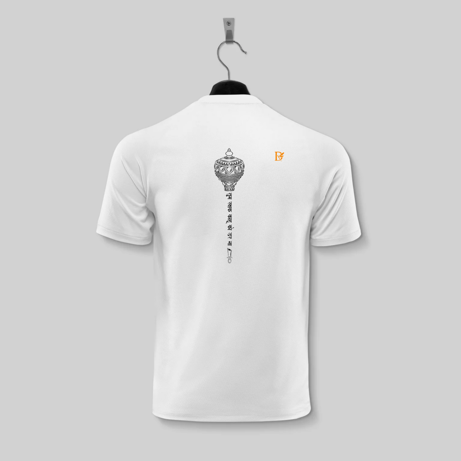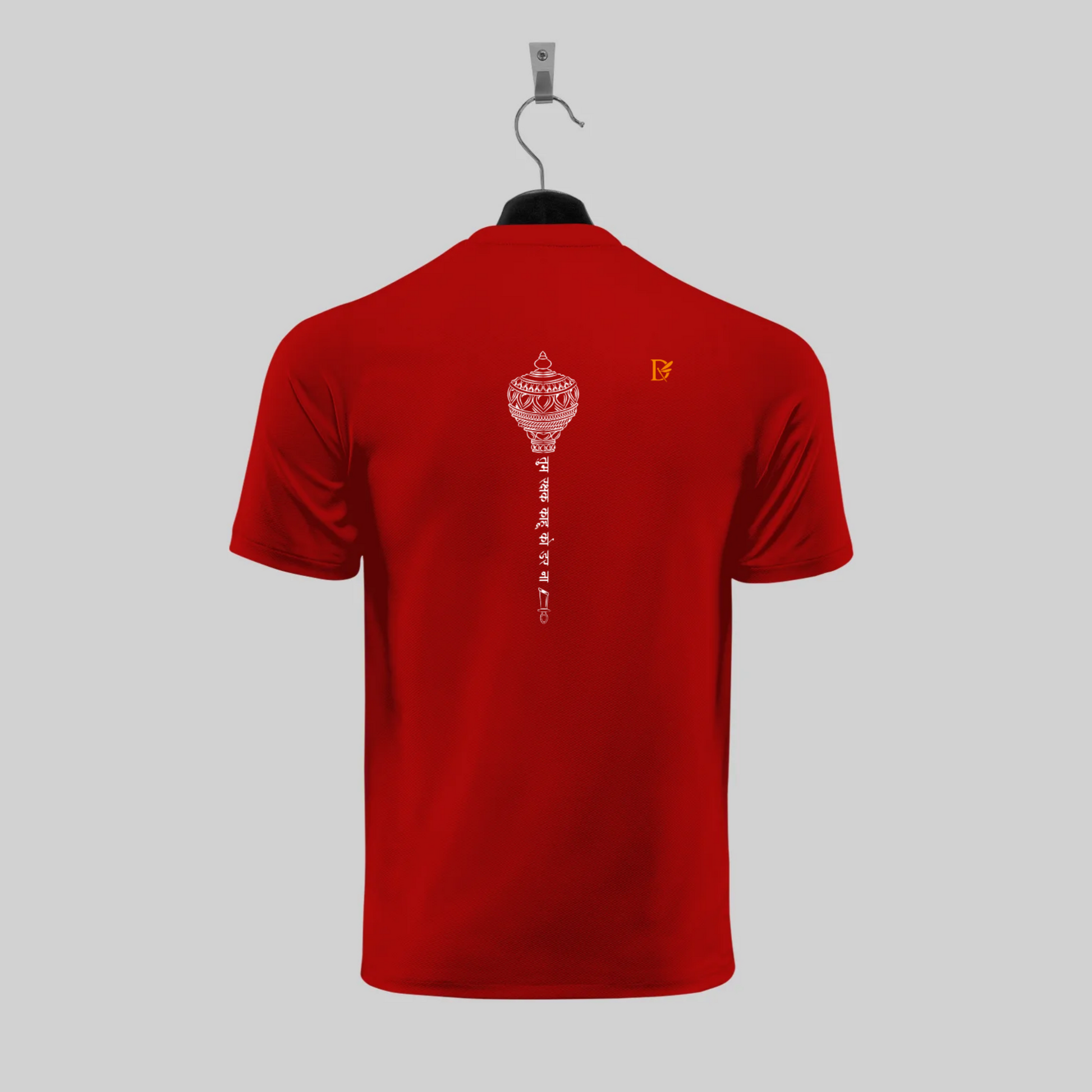 Featuring a bold, minimal artwork of a divine archer in striking white against a rich red base, it symbolizes focus, discipline, and inner power. The signature Dragonfli emblem embroidered in gold at the chest completes the design with a touch of understated luxury.